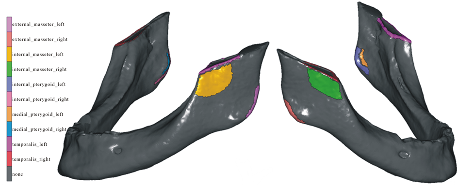 To simulate muscular loads, a control node was created and linked to the nodes located near the insertion zones identified as (1). A force was applied to the control node in the physiological direction of the muscle. The internal and external masseter, medial and internal pterygoid, and temporalis muscles were considered in this model; the lateral pterygoid muscle was not included. The muscular force values were taken from literature (1): the muscular load application areas are shown in Figure 2, and the directional cosines of the loads are listed in Table 2. Moreover the numerical values of the muscular loads are scaled in respect to (1) in order to yield an occlusal force of about 400 N, as in [19] . The kinematics of the mandible was modelled with two cylindrical joints at the condyle areas as shown in Figure 1. In analogy with physiological behaviour, the rotation of the structure was constrained by a contact support in dental bridge which reacts to the jaw closing force. The corner of the bridge (Figure 3(a)) was chosen to simulate the worst-case loading scenario [6] . The bone-fixture interface was modelled as a fully adherent interface between the two elastic bodies. Full displacement continuity was granted across the interface; the normal stress component and tangential shear actions were also continuous. This behaviour marches a complete osseointegration. The fixture-abutment interface was also analogously modelled in order to simulate a regularly tightened threaded connection.