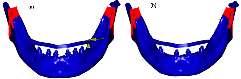 Figure 3. Model of the six-implant (a) and all-on-four (b) configuration . In the six-implant image the yellow arrows indicate the fixed displacements of the dental bridge. In both models the red links indicate the muscular loads.
