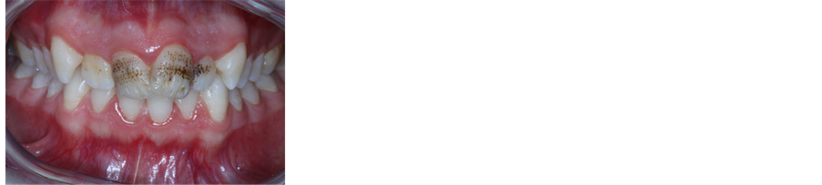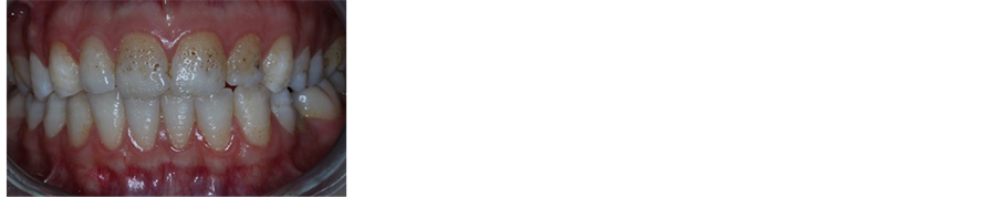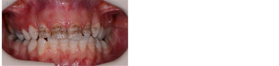 Case 3 was a 17-year-old female patient (G.Y.) who presented no abnormal medical history or systemic problems except for AI. She was a sister of Case 1. A diagnosis of hypoplastic AI was made as in Case 1. She had slightly yellowish/brown and stained, pitted, and hypoplastic enamel (Figure 9). The enamel appeared hard and shiny. There was no occlusal tooth wear, fractured enamel, or tooth sensitivity. The patient’s vertical dimension was normal. Oral hygiene was good and the gingival tissue was healthy. Caries risk was assessed as a “low risk”. Her primary concerns included esthetic failure of the upper anterior region teeth. No orthodontic treatment was performed because the patient refused to wear brackets.