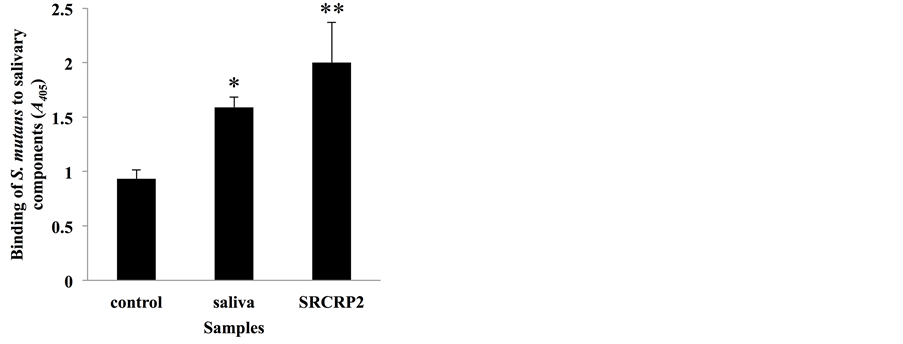 Figure 1. Adherence of S. mutans to saliva and to salivary agglutinin peptide SRCRP2. Binding response of biotinylated S. mutans to saliva and to salivary agglutinin peptide SRCRP2 (200 µg/ml). Binding is expressed as A405 values obtained from three independent experiments. Values are expressed as means ± standard deviation (SD) of triplicate assays. Asterisks denote significant differences (vs. control: DW; *P < 0.05, **P < 0.01).