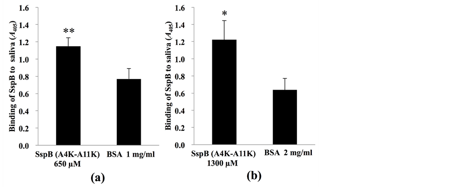 Figure 2. Sandwich assay with biotinylated and non-biotinylated SspB (A4K-A11K). (a) Microtiter plates were coated with non-biotinylated SspB (A4K-A11K) at 650 µM and (b) at 1300 µM. Sterile saliva was added to the wells of coated plates, and then 650 µM biotinylated SspB (A4K-A11K) was added. Data are expressed as A405 values obtained from three independent experiments. Values are expressed as means ± SD of triplicate assays (vs. control: BSA;*P < 0.05, **P < 0.01).