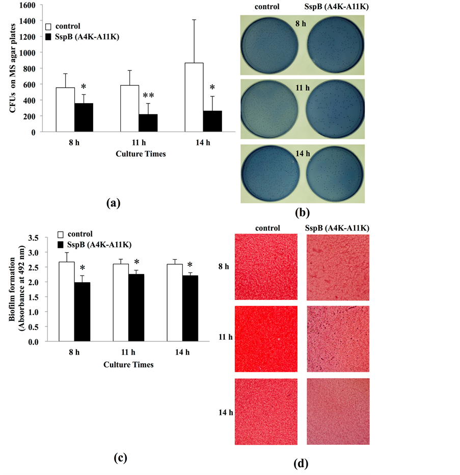 Figure 3. Inhibition using SspB (A4K-A11K) of S. mutans biofilm formation on s-HA. (a) The amounts of biofilms were expressed as a colony forming unit (CFU). (b) Photographs of S. mutans colonies on MS agar plates at 8, 11, and 14 h culture (40×). (c) Formed biofilms were stained with safranin and were measured the absorbance at 492 nm. (d) Photographs of S. mutans biofilms on s-HA disks at 8, 11, and 14 h culture (40×). Data are expressed as the means ± SD of triplicate assays (vs. control: non-treated s-HA; *P < 0.05, **P < 0.01).