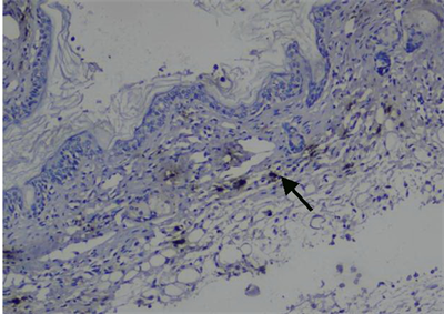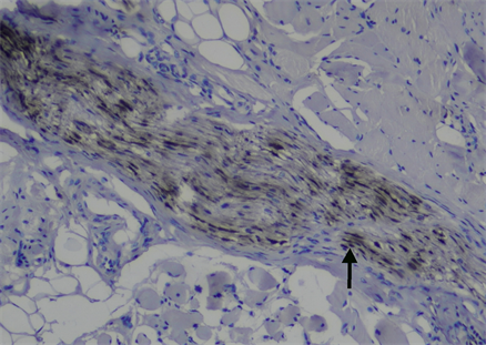 Figure 1. NF-L staining in human tissue. NF-L staining positive indicating new growth of nerves (×100).