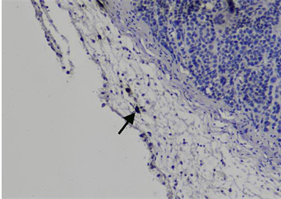 Figure 2. NF-L staining in murine model. (a) 2 weeks; (b) 4 weeks; (c) 6 weeks. NF-L staining positive indicating new growth of nerves, and the number increasing with tumor growth (×100).
