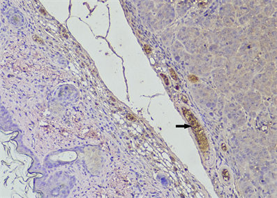 NF-L staining is positive in the paraffins from animal models even in the murine tissue from 2 weeks indicating that the tongue cancer recruits newly formed nerves in its initiation and development (details in Figure 2(a)). With the growth of tumor in 4 and 6 week, the number of newly formed nerves is increasing (details in Figure 2(b), Figure 2(c)).