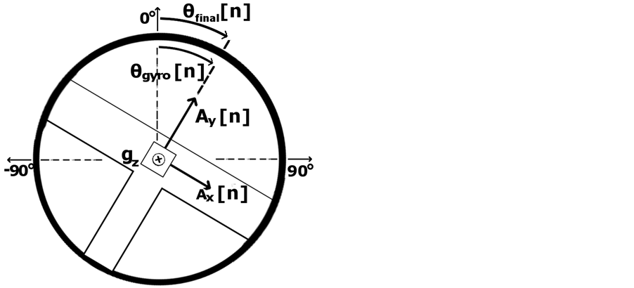 The addition of an accelerometer to the gyroscope compensated for gyroscope drift via the accelerometers perpetual ability for gravitational alignment. This is predicated upon the fact that the operation of Equation (2) depends upon relative readings of gravity on the accelerometers separate axes. The accelerometers tendency to pick up linear vibrations was in turn countered by the gyroscope which has sensitivity to angular velocity. The IMU fusion led to a highly effective combination. When the steering wheel was in a neutral position as shown in Figure 1, the main sensor was fastened to the steering wheel surface such the accelerometer gave a neutral angular reading of