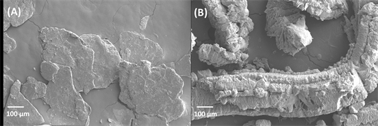 Figure 5. SEM Image of Expandable graphite (A) before Cone calorimetry test (B) after Cone calorimetry test.