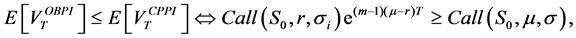 -We have found that the CPPI method third order stochastically dominates the OBPI one for high implied volatility relatively to the empirical volatility;