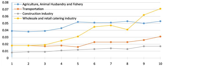 As can be seen from Figure 1 that, the carbon emissions of wholesale and retail industry show a rapid growth trend, and the annual emission growth of this industry is about 3.2 million tons. Especially tourism and catering services play an important role in the western region, and there are still much work to be done in low carbon tourism facilities construction, low carbon tourism, the elimination of food waste, the prohibition of disposable tableware, the diversified treatment of catering garbage and rational recovery and utilization of resources [17] . Taking the use of disposable tableware as an example, about 45 billion pairs of wooden chopstick in catering industry are annually consumed, and it is equivalent to reducing forest area of 2 million square meters. It is equivalent to reducing forest area of 2 million square meters. This not only caused great damage to environmental resources, but also reduced at least 1 million tons of carbon absorption. Therefore, the potential of energy saving and emission reduction in wholesale and retail industry is very huge.