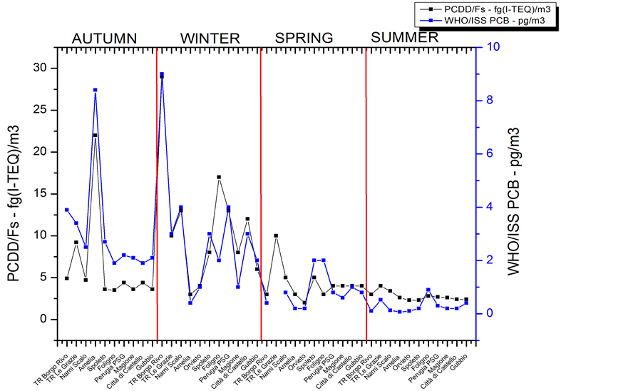 Figure 4 shows the seasonal average concentrations of PCDD/Fs (fg (I-TEF)/m3) and PCB pg/m3 in PM10 for different sites in the network. With the exception of the site of Amelia, for which a high value during the autumn