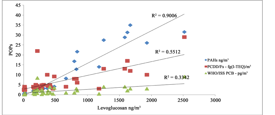 Figure 5 shows the levoglucosan correlation with PAHs, PCDD/Fs and PCBs. From the graph it is clear that there is a high degree of correlation between levoglucosan and PAHs confirming a common source of emission (combustion of Biomass) and a lower degree of correlation between levoglucosan, PCDD/Fs and PCBs to indicate the possible influence of other sources.