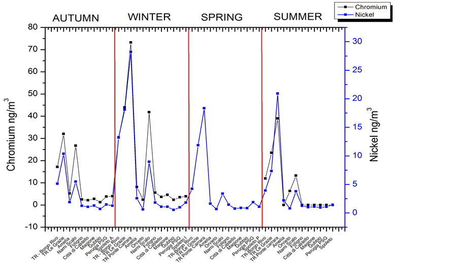 The anthropization of “Conca Ternana”, urban sites of Terni and sub-urban site near Terni (Narni), is even more evident if the comparison is made between the concentrations of some metals in PM10. As an example is shown in Figure 6 the diagram that relates chromium and nickel in different monitoring sites during the reference period. Where there is the steel production plant the values of the two metals are very high, this fact stands