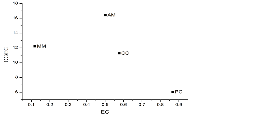 About OC/EC were selected urban background samples (AM: Amelia, CC: Città di Castello, PC: Perugia) and rural background samples (MM: Monte Martano). The high value of the ratio OC/EC in rural background is likely due to a strong biogenic components in the OC, the EC values (traffic marker) are very low in these samples as we can expect in a rural background; the low value of the ratio OC/EC in PC can be explained by a greater contribution of EC instead. The other two sampling points are placed in intermediate positions; the three urban backgrounds are ideally located along a line, the rural background shows values completely different (Figure 7).