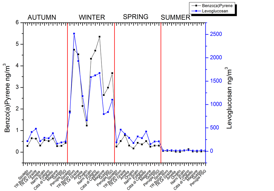 In Figure 2 the average seasonal concentration of PAHs and levoglucosan measured in 11 sample sites of the network is shown: the high seasonality observed for PAHs is due to the domestic heating during winter time and to the different meteorological conditions that, during summer, cause PAHs photodegradation and an easier atmospheric dispersion of pollutants.