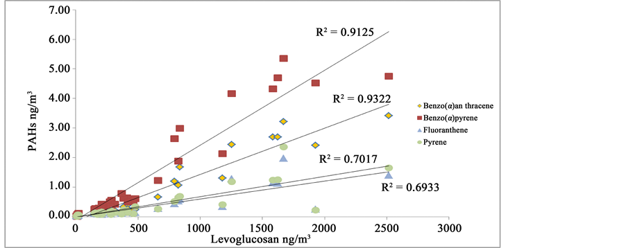 The levoglucosan is indeed well correlated with those congeners of PAHs that literature studies attribute to the prevailing domestic heating source such as Benzo[α]Pyrene (BaP) (CASRN 50-32-8) | IRIS | US EPA and Benzo[α]Anthracene (CASRN 56-55-3) | IRIS | US EPA (R2 from 0.91 to 0.93) and less correlated with those congeners that are more related to the vehicle traffic like Fluoranthene (CASRN 206-44-0) | IRIS | US EPA and Pyrene (CASRN 129-00-0) | IRIS | US EPA (R2 = 0.70), Figure 3. Moreover the Indeno [1] -[3] Pyrene (CASRN 193-39-5) | IRIS | US EPA /Benzo[ghi]Perylene (CASRN 191-24-2) | IRIS | US EPA ratio estimated in all sites ranged from 0.7 to 1.2, typical of diesel engine [8] .