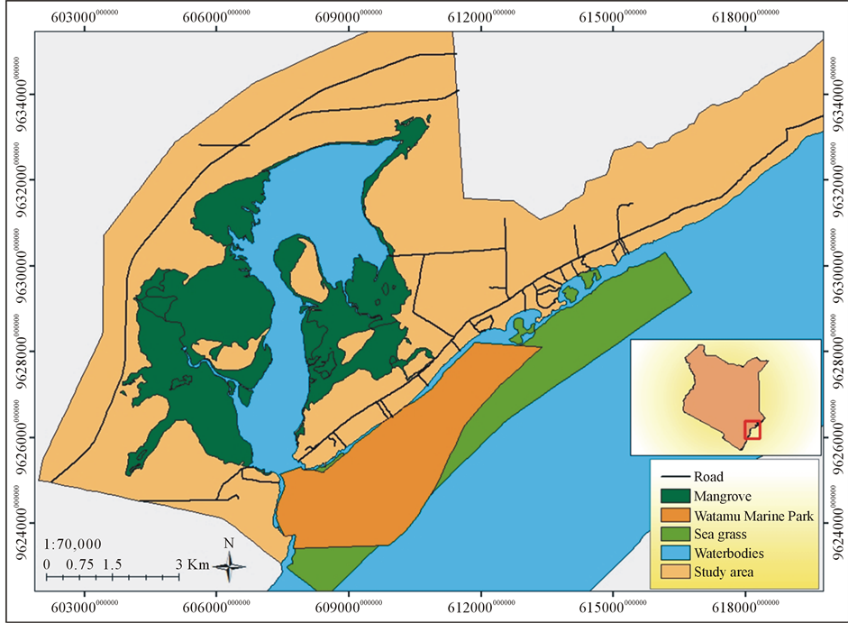 The study was conducted in Watamu Mida creek, in Coast Province, Kilifi County, Kenya (Figure 1). The study area covered approximately 60 square kilometers. Mida creek is a biologically important and complex tidal marine multi-habitat ecosystem supporting the adjacent local communities by providing foods, building materials and tourism revenues (Weru et al., 2000) . The Creek expands across an area of 32 square kilometers. According to the population census of 2009, the population of the study area was 101,689 with estimated growth rate of 3.05% (GOK, 2009) .
