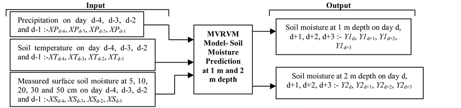 Our goal was to forecast root zone soil moisture at 1 and 2 m depths. This was done by assimilating soil moisture (m3/m3) at shallower depths (5, 10, 20, 30 and 50 cm), soil temperature (Celsius) and precipitation (mm), and predicting soil moisture at depths of 1 and 2 m. The time series soil moisture data for 12 months were downloaded from the Natural Resource Conservation service (NRCS) website. A stratified sampling of the 12 months of data was carried out and the training and testing data were extracted from this stratified sample. The test data were kept aside for validating the performance of the machine. The stratified sampling was done to train the MVRVM model for different values of soil moisture in different seasons. It was observed that normalization of the data between −1 and 1 produced better results as compared to the case where raw data were used. Hence the data were normalized. The MVRVM model was trained with 227 days of soil moisture data spread over a year and corresponding soil temperature and meteorological data. The inputs to the model were precipitation, soil temperature, and soil moisture data on days “d−4”, “d−3”, “d−2”, “d−1”. The output of the model was forecasted soil moisture values at “d”, “d+1”, “d+2” and “d+3”. Time steps were in days. The performance of the model was tested with 100 days of input data spread over a year. Figure 2 shows the flow diagram of the model approach in the training phase. Three analyses were done with different inputs. For the first analysis, the MVRVM model was trained using soil moisture at depths of 5, 10, 20, 30 and 50 cm below ground surface, soil temperature (Celsius), and precipitation (mm) as inputs. The second analysis was similar to the first one but it only used soil moisture at 5 and 10 cm, soil temperature (Celsius), and precipitation (mm) as inputs to train the MVRVM model. The third analysis used soil moisture at 30 and 50 cm, soil temperature (Celsius), and precipitation (mm) as inputs to train the MVRVM model. The output in all three cases was soil moisture at 1 and 2 m depths on d, d+1, d+2 and d+3, i.e. four days into the future. The latter two analyses were carried out to observe the variation in the model output when moisture in the topsoil (5, 10 cm) and then at larger depths (30, 50 cm) were used to train the learning machine. Figure 2 shows the MVRVM model approach. The model inputs were: x = [XPd−4, XSd−4, XTd−4, XPd−3, XSd−3, XTd−3, XPd−2, XSd−2, XTd−2, XPd−1, XTd−1, XSd−1], where, d = time (day) and the model outputs were: y = [Y1d, Y2d, Y1d+1, Y2d+1, Y1d+2, Y2d+2, Y1d+3 Y2d+3].