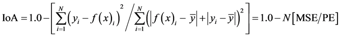 where N is the number of testing samples. In this formulation, y and f(x) are the measured and modeled values, respectively. The RMSE and MAE measure the error between the actual data and modeled values. Large values of RMSE or MAE mean that the difference between the actual measurements and the modeled values is large; hence the model is not performing well enough. Both the MAE and RMSE can range from zero to infinity. Lower values are better. The RMSE has the same dimensionality as the data and therefore it is easy to interpret. The IoA is calculated by comparing an observed group variance with an expected random variance. It varies from zero (inferior model) to one (excellent model). Potential Error (PE) is defined as the sum of the squared absolute values of the distances from f(x)i to ӯ and from yi to ӯ and represents the largest value that it can attain for each actual observation/simulated value pair [40] . CoE ranges from −∞ (inferior model) to 1 (excellent model) [41] . Thus, a value of zero for the CoE indicates that the observed mean, ӯ, is as good an estimator as the model, while negative values indicate that the observed mean is a better estimator than the model [42] .