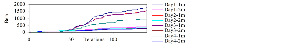 The goal of this research was to forecast spatio-temporal estimates of root zone soil moisture at depths of 1 and 2 m below ground surface. A MVRVM model was used to build the model. This section discusses the selection of model parameters, MVRVM model performance, and the bootstrap analyses. Evaluation of RVM performance was based on selection of optimal kernel width and optimized iterations. Several trials were performed for obtaining the optimal values of these parameters. For the MVRVM, the parameters α and σ2 were automatically estimated by the learning procedure. The optimal kernel width for the MVRVM model was obtained through a trial and error procedure, and the optimal number of iterations was obtained by plotting parameter beta against the number of iterations. The number at which the value of the parameter beta became almost constant was considered to be optimal. Figure 3 shows the plot of the parameter beta with respect to the number of iterations.
