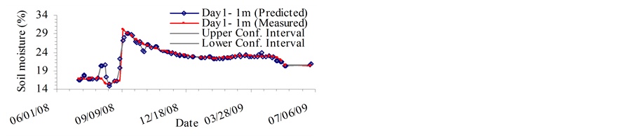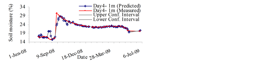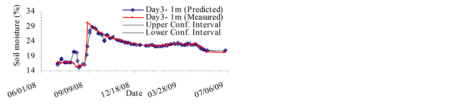 The MVRVM model exhibits good performance. Figure 4 and Figure 5 show predicted outputs versus original data and the confidence bounds for the test phase. The results produced by the MVRVM model in the test phase for SMC estimate at 1 m depth for four consecutive days are shown in Figures 4(a)-(d). The MVRVM model showed good results with the forecasted values of soil moisture closely following the pattern of the time series. Table 1 shows the goodness-of-fit test results for the test data. The average maximum value of soil moisture at 1 m depth is about 30%, and the minimum is about 15%. The correlation result for the MVRVM model on the fourth day at 1 m depth (see Table 1) demonstrated good performance (R2 = 0.877 and RMSE = 1.31%), with an IoA of 0.96 and the CoE of 0.87. This indicated that the observed data and modeled values were close. The bias is very small indicating that the estimator is robust. The average MAE for 1 m depth was 0.5 which suggested that model estimates differed from the data on an average of 0.50%. The results produced by the MVRVM model in the test phase for SMC estimates at a depth of 2 m are shown in Figures 5(a)-(d). Again, the MVRVM model showed excellent results with forecasted values closely following the pattern of the time series. The average maximum value of soil moisture at 1 m depth is about 19%, and the minimum is about 15%. The correlation result for the MVRVM model on the fourth day at a depth of 2 m (see Table 1) again demonstrated good performance (R2 = 0.968 and RMSE = 0.15%), with an IoA of 0.99 and a CoE value of 0.97. This indicated that observed data and modeled values were very close. The average MAE for 1 m depth was 0.08 which suggested that model estimates differed from the data by an average of only 0.08%. The number of relevance vectors (RVs) used in the MVRVM model was 81 out of 227 training points.