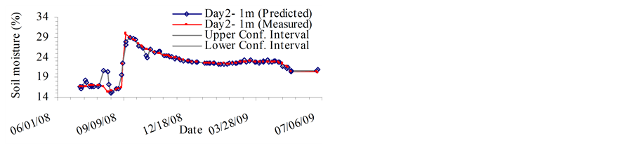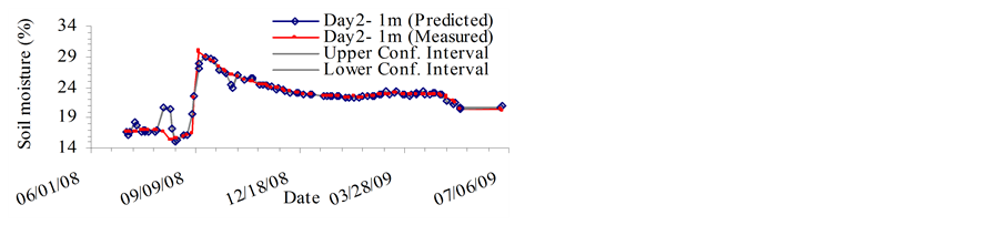 Better results were obtained for soil moisture forecast at 2 m depth in comparison to those obtained at 1 m depth. The variation in moisture at larger depths is smaller than at shallower depths. Due to subdued soil moisture dynamics at 2 m depth, the machine has a simpler pattern to learn and forecasting soil moisture at 2 m depth becomes comparatively easier.
