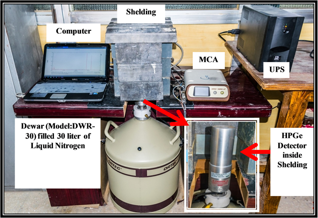 Thirty one sample of different kinds of tobacco cigarettes were collected from Iraqi Market by 10 packets (200 cigarettes) each type. It is chosen in terms of the most common type used by smokers. The collected samples were grind to a fine powder after removing the paper and filters from cigarettes, using hand mill and electrical China mill. The fine powder will convert to the grain size of 650 µm using special Germany sieves (mesh). The samples were packaged in a 1 liter Marinelli beaker, the sealed marinelli beaker were kept for eight weeks before measurements in order to achieve the secular equilibrium for U-238 and Th-232 with their respective progenies. The net weight of the samples has been measured. Gamma rays, due to the environmental radioactivity emitters, in the cigarettes tobacco samples were subjected to gamma spectrometry system, which consist of coaxial (HPGe) detector, with an efficiency of 40% as shown in Figure 1.