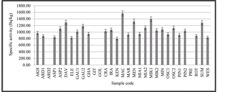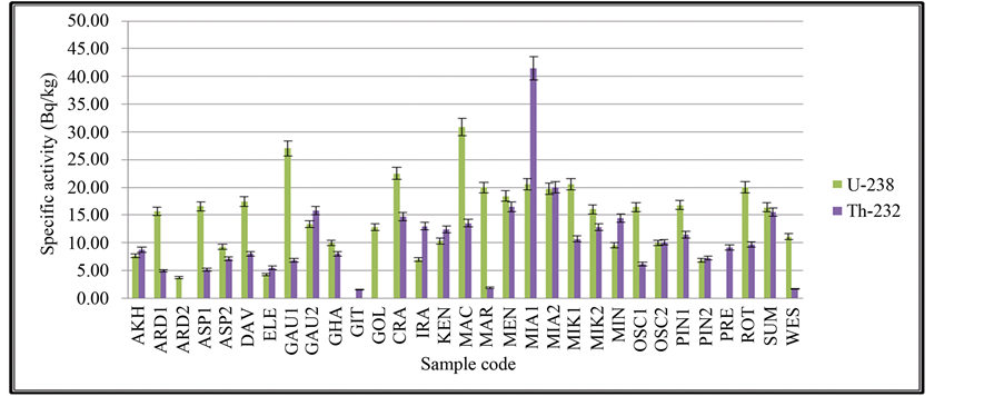 specific activity concentrations for U-238, have been found to be in the range of 3.75 ± 1.94 Bq/kg in England tobacco sample (ARD2) to 30.92 ± 5.56 Bq/kg in Brazilian tobacco sample (MAC) with an average of 14.86 ± 3.76 Bq/kg. While for Th-232, they are within the range of 1.59 ± 1.26 Bq/kg in European sample (GIT) to 41.50 ± 6.44 Bq/kg in American sample (MIA1) with an average of 10.84 ± 3.13 Bq/kg. The specific activity for K-40 are from 801.41 ± 35.5 Bq/kg in British tobacco (KEN) to 1567.46 ± 58.97 Bq/kg in Brazilian tobacco sample (MAC) with an average value of 1050.64 ± 47.57 Bq/kg.