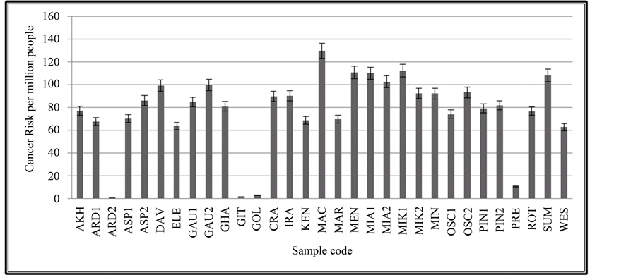 This gives the probability of developing cancer over a lifetime at a given exposure level, It is presented as a value representing the number of extra cancers expected in a given number of people with exposure to a carcinogen at a given dose, and we can calculate (ELCR) by equation (5) if considering 70 years as the average duration of life for human being [13] .