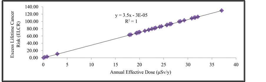 Excess lifetime cancer risk (cancer risk per million people per year) ranges from 0.54 in (ARD2) sample to 129.70 in (MAC) sample with an average value of 76.95. see Figure 10. Figure 11 shows the relationship between cancer risk per million smoker per year and annual effective dose for each sample This is an indication that there is a linear relationship between the cancers and the annual effective dose rates of cancer increases with dose.