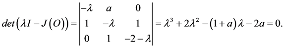 The characteristic equation for the Jacobi matrix at point O looks as follows: