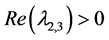 Thus, we get that under the condition (13) for the existence of one real and two complex conjugate roots and the condition (14) for negativity of a real root and the positivity of complex conjugate roots, the equilibrium point