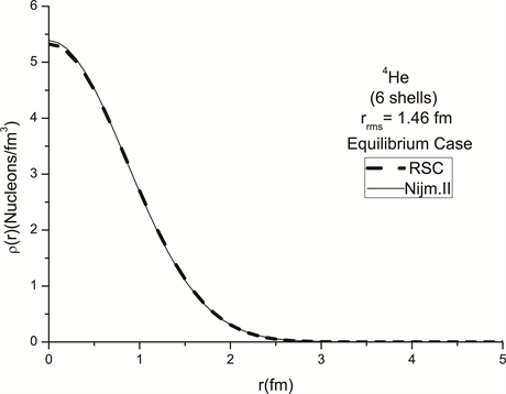 Figure 5. (dashed curve) radial density distribution for 4He at point mass and solid cure for equilibrium case in a 6 shells space by using RSC potential.