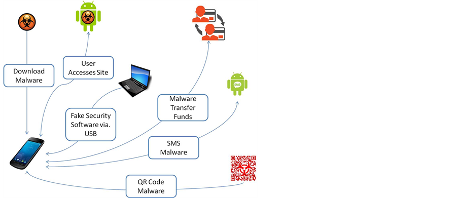 The Android system that we have used in our research and implementation is eclipse, which is a worldwide platform for integrating development tools, and is part of JDT. It is one of the open sources IDE, which allows user to create an application for Android. All Android system compatible devices support 32 and 64-bit pro- cessing. The entire Android system architecture uses a Linux based system which can be customized. This platform interacts with mobile devices such as phones and tablets. Mobile Malware architecture is illustrated in Figure 2. The components of a system are: user accesses site, downloads fake antivirus software, downloads malware, malware transfers funds, transaction approves SMS, and malware forwards approval of SMS. There are many mobile devices, which can be targeted by malware. Especially, the Android system can be attacked by various ways.