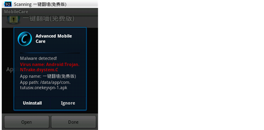 We tested malware programs to see if anti-malware could get rid of malware problems by looking at codes. The reason we looked at the codes was that we needed to understand the problems in the malware. The malware we tested against anti-malware were droid kung fu and DroidDream, which were popular malware on the mobile device. Figure 3 shows the anti-virus counter that the malware uses for getting into the user’s mobile device. Many trails and tests were run to figure out if the current anti-malware was updated and could work on the popular malware. The anti-malware is the best solution to deal with malware from getting in the user mobile device. Based on our test results, legitimate anti-malware seems to be the best solution to deal with malware problems suggested for an average user. Also, the coding for malware can be very complex and difficult for a normal user. The experimental results show that anti-malware can detect most malware on mobile devices. Users should legitimate anti-malware applications from advancing mobile care, Avast, AVG, and Lookout.