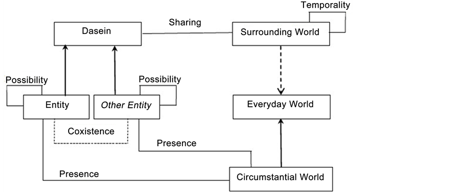 In his work “Being and Time”, Heidegger ponders about the term “Being”. He is not based on the question of “Being” of “Entity” of the things (consisting of simple presence in the world), but on the “Being” of “Entity” of man, the only “Entity” capable of to question about the “Being”. The “Being” of man does not consist in a mere presence in the world, but in a “Being-there” (Dasein), which is defined from the following elements: “being-in-the-world”, “being-with-other”’ and “being-for-death” [4] . Figure 1 illustrates the triad of Dasein.
