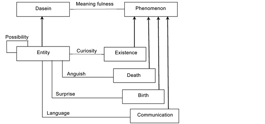 Dasein seeks to give meaning to certain phenomena he perceives, especially to the phenomena of existence, death, birth and communication, each entity being related in a different way to these phenomena. Existence arouses curiosity to the entity, while death generates anxiety and surprise birth. In relation to communication, it occurs through language. Figure 4 illustrates the context of “being-towards-death”.