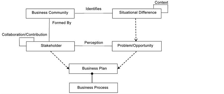 Identification, which is identified by the business community and perceived as a problem and/or opportunity by one of its members (interested in the situational difference). As a result, it produces a business plan to deal with the problem and/ or opportunity. The production of that plan results in a business process, eventually the target of a technological support.