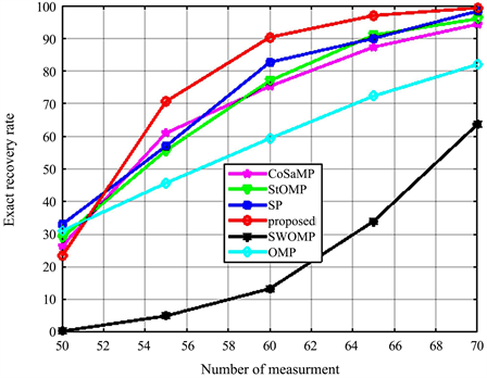 As shown in Figure 1, we provide the rate of exact reconstruction performance as a function of the measurement number M. Figure 1 shows the curves of the probability of exact recovery signal with the proposed algorithm. 500s simulations were conducted for the different number of measurements M. The exact recovery rate of the proposed algorithm at M = 60 increases by 90%. And overall, the algorithm proposed in this paper is also superior to other classical algorithms in Figure 1.