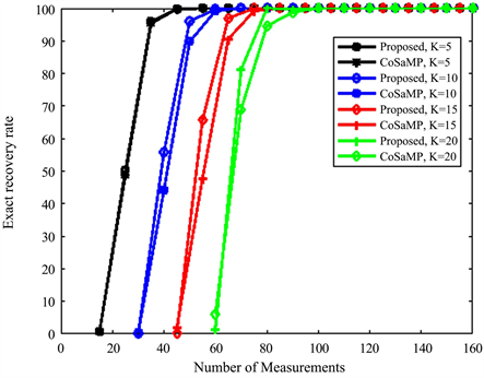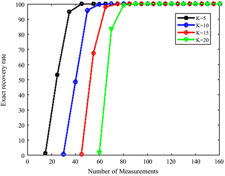 Figure 3 shows the curves of the probability of exact recovery signal with proposed algorithm. The number of measurements (M), given a fixed signal sparsity K. 500 simulations were conducted for each pair of sparsity K and the number of measurements M. Figure 3 shows that the proposed algorithm has higher stability and reliability in terms of exact recovery of the signal.