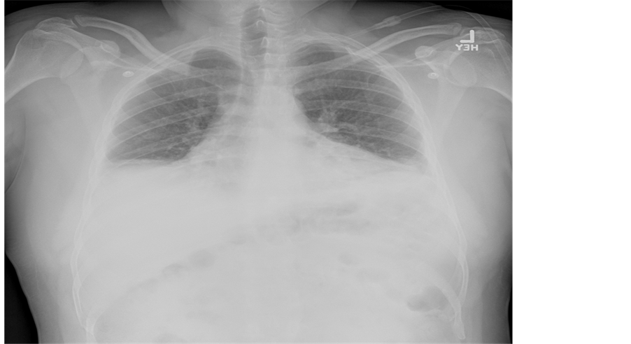 Figure 1. The figure is an erect anterior chest x-ray of the patient showing bilateral pleural effusions and lung opacification. Also noted is hypo aerated lung fields with costophrenic blunting.