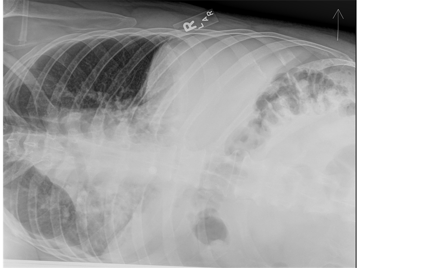 In the emergency department, the patient was in moderate distress and diaphoretic, sitting up in the stretcher. His presenting vital signs were temperature of 37.4˚C (oral), blood pressure of 128/90 with a pulse of 95. Of considerable concern was the patients increased work of breathing with a respiratory rate of 22 and pulse oximetry reading of 91% on room air representing worrisome hypoxia. The patient was placed on 2 L supplemental oxygen via nasal cannula with improvement of his oxygen saturation to 96% and lessened his air hunger.