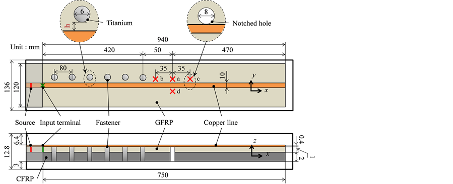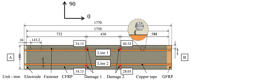 Figure 5 shows the dimensions and configuration of the specimen. The specimen was 1750 mm long, 200 mm wide and 2.6 mm deep. The material used to fabricate the CFRP laminate was Toray T800S/epoxy prepreg P2352W-19 (cure temperature 180˚C). The stacking sequence of the CFRP plate was [0/45/0/ - 45/90/45/0/ - 45/90]s. On the CFRP specimen, a GFRP fabric plate 1730 mm long, 200 mm wide and 0.5 mm deep was attached using commercially available epoxy adhesive. On the GFRP plate, copper tape 5 mm wide and 0.025 mm thick was attached as shown in Figure 5 to create two micro-strip lines. The triangle symbols indicate the location of fasteners of 6.35 mm diameter. The spacing of the fasteners was 143.2 mm for the specimen. The characteristic impedance calculated from the Equations (1) to (4) was approximately 15 W. Because it was quite difficult to obtain a transmission line of exactly 50 W using commercially available GFRP plate and copper tape, the characteristic impedance of the MSL was set to 15 W in this study.