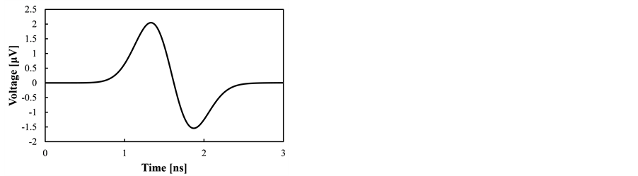 where c is the speed of light. To satisfy Courant’s stability condition, the time step is set to Dt = 0.5 ps. The specific magnetic permeability of the entire region is set to mr = 1.0. The specific dielectric constant of air is er = 1.0, and the specific dielectric constant of GFRP is set to er = 4.0. The conductivity of copper is 5.96 × 107 S/m, and the conductivity of CFRP measured by Hirano et al. [16] was used in this study. A pulse signal was input from the left terminal. Figure 3 shows the input Gaussian pulse signal for the FDTD analysis.