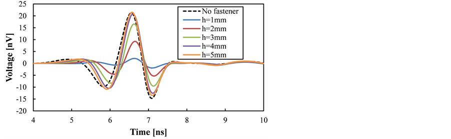 Figure 4 shows the results of the reflected signal calculated at the input terminal. The abscissa shows the time and the ordinate shows the voltage. The broken curve represents the reflected signal of the specimen without fasteners. As shown in Figure 4, when the fasteners approach the MSL, the amplitudes of the reflected signals decrease. For example, the nearest case of h = 1 mm had only 11% of the amplitude compared with the amplitude of the reflected signal without fasteners. The decrease in signal amplitude was caused by the scatter of electromagnetic wave at the metallic fasteners. When h = 4 mm, the amplitude of the reflected signal was 92%. The results showed that the h = 4 mm was the minimum requirement for the distance between the fasteners and the MSL with these dimensions.