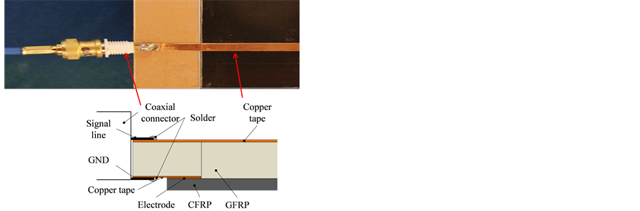 Figure 6 shows a view of the input terminal at the specimen end. A coaxial cable was connected to the micro- strip line by soldering as shown in Figure 6. At the CFRP specimen edge, electrical copper plating was carried out to make electrical contact.