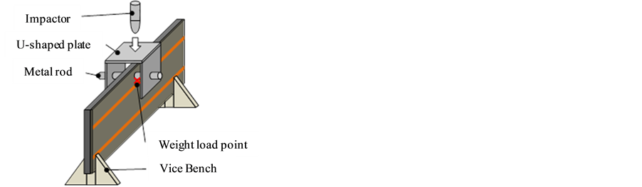 men using a normal material testing machine. In this study, therefore, a drop weight loading was adopted to make a simulated bearing fracture at a fastener as shown in Figure 7. For Line #1, an impact energy of 34.1 J was added to Damage #1, and 40.3 J was added to Damage #2. For Line #2, 34.1 J was added to Damage #1 and 28.0 J was added to Damage #2. The impact load was applied in the direction of the MSL. The examples of the bearing failures are shown in Figure 8. A white area peeled off the GFRP because of the bearing failure.