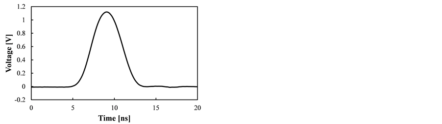 Pulse signals were generated using a function generator AFG3251 (Max 240 MHz, Tektronix, Tokyo Japan), and the signal was applied to the MSL. The reflected signals were measured using a digital oscilloscope TDS5034B (sampling interval 4 ps, Tektronix, Tokyo Japan). A directional coupler, ZFDC-10-5 (Mini-Circuit, Yokohama, Japan), was adopted to select the pulse signal wave reflected from the specimen. The pulse signal made by the function generator is shown in Figure 9. The measurements were repeated 100 times, and the averaged value was used as the measured result. A FIR low-pass filter in MATLAB (cut-off frequency is 0.5 GHz) was used to remove high frequency noise.
