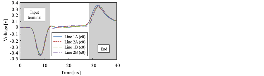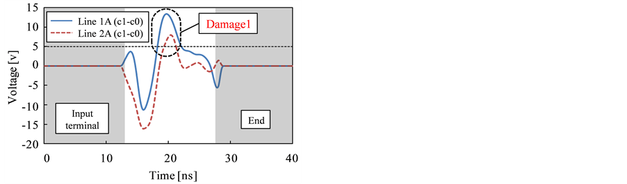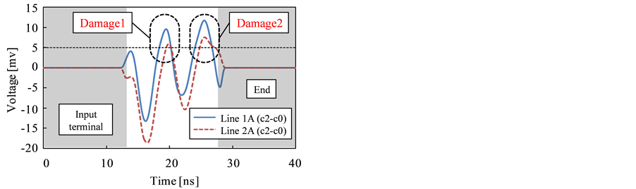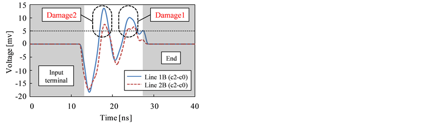 Figure 10 shows the measured results of the reflected signals for Condition #0. The abscissa is the time and the ordinate is the measured signal voltage. Figure 10 includes the results for Lines #1 and #2 of the A and B input terminals. Because the input terminal and the end terminal have slight impedance mismatching, a reflected signal was observed. Using the length of the specimen and the time difference between the input terminal and the end terminal, the average velocity of the pulse signal was calculated. The signal velocity for Line #1 was 1.474 × 108 m/s and for Line #2 was 1.444 × 108 m/s. Because the standard deviation of the 100 measurements for Line #1 was 0.0176 × 108 m/s, the difference between Lines #1 and #2 was not the result of any measurement error. Line # 1 had fasteners at a distance of h = 4 mm, and Line #2 had no fasteners near the MSL. Although the FDTD results in Figure 4 indicated that there was no effect on the fasteners when h = 4 mm, the experimental results showed that a small increase in signal velocity was obtained when the fasteners were located at the line of h = 4 mm from the time difference of the peak point in each cases. The measured velocities were used to determine the location of the damage.