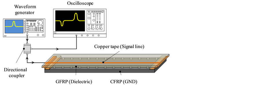 A MSL type transmission line was used in this study as shown in Figure 1: a narrow copper strip tape and a CFRP laminate were used as the two conducting materials and a GFRP plate as an insulator between them. The characteristic impedance of the narrow-strip transmission line was obtained as shown by Wadell [15] .