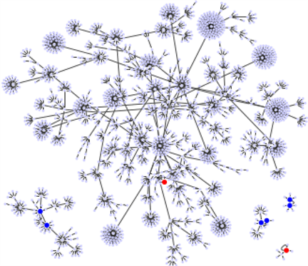 flowing to the fixed points given in Table 2. The red circles are the point attractors of , and the blue circles indicate the four point attractors newly added by the network becoming . Obviously, the basin size of the same attractor of to those of attractor of is smaller than those of , and they are caused by branching from the basin of . Accordingly, it is also easy to understand that all attractors (attractor sets) of the original network are included in the attractor set of . The attractor of the large BS of corresponds to the attractor of the relatively large BS of .